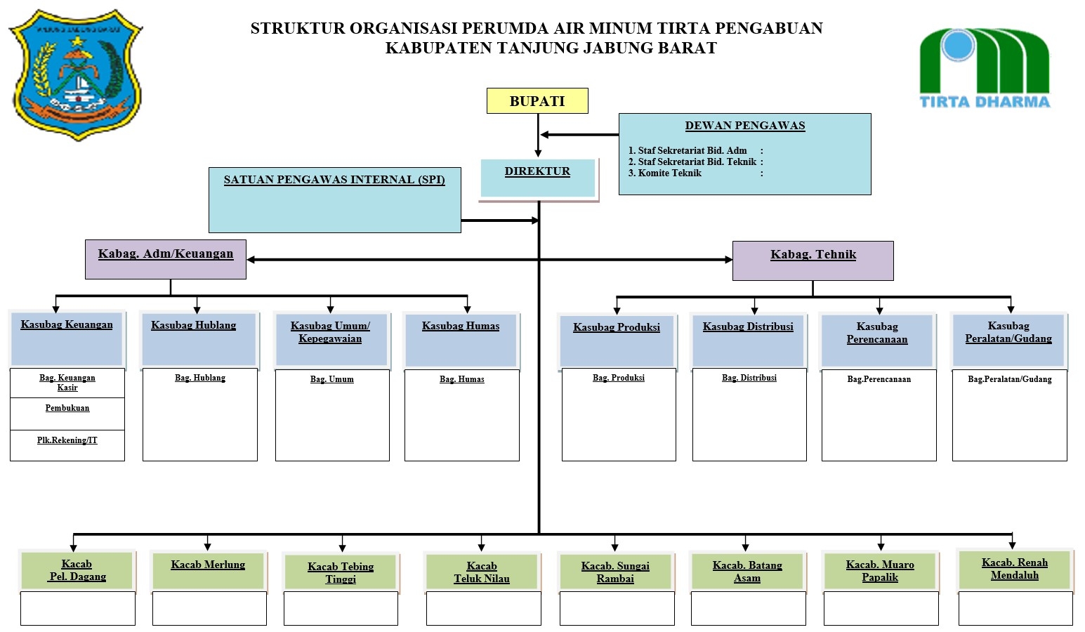 Berdasarkan keputusan direksi Perusahaan Daerah Air Minum (PDAM) Tirta Pengabuan Kabupaten Tanjung jabung barat Nomor 800/KPTS/690.74/VI/2010 tentang struktur organisasi dan tata kerja Perusahaan Daerah Air Minum (PDAM) Tirta Pengabuan Kabupaten Tanjung Jabung Barat, terdiri dari :